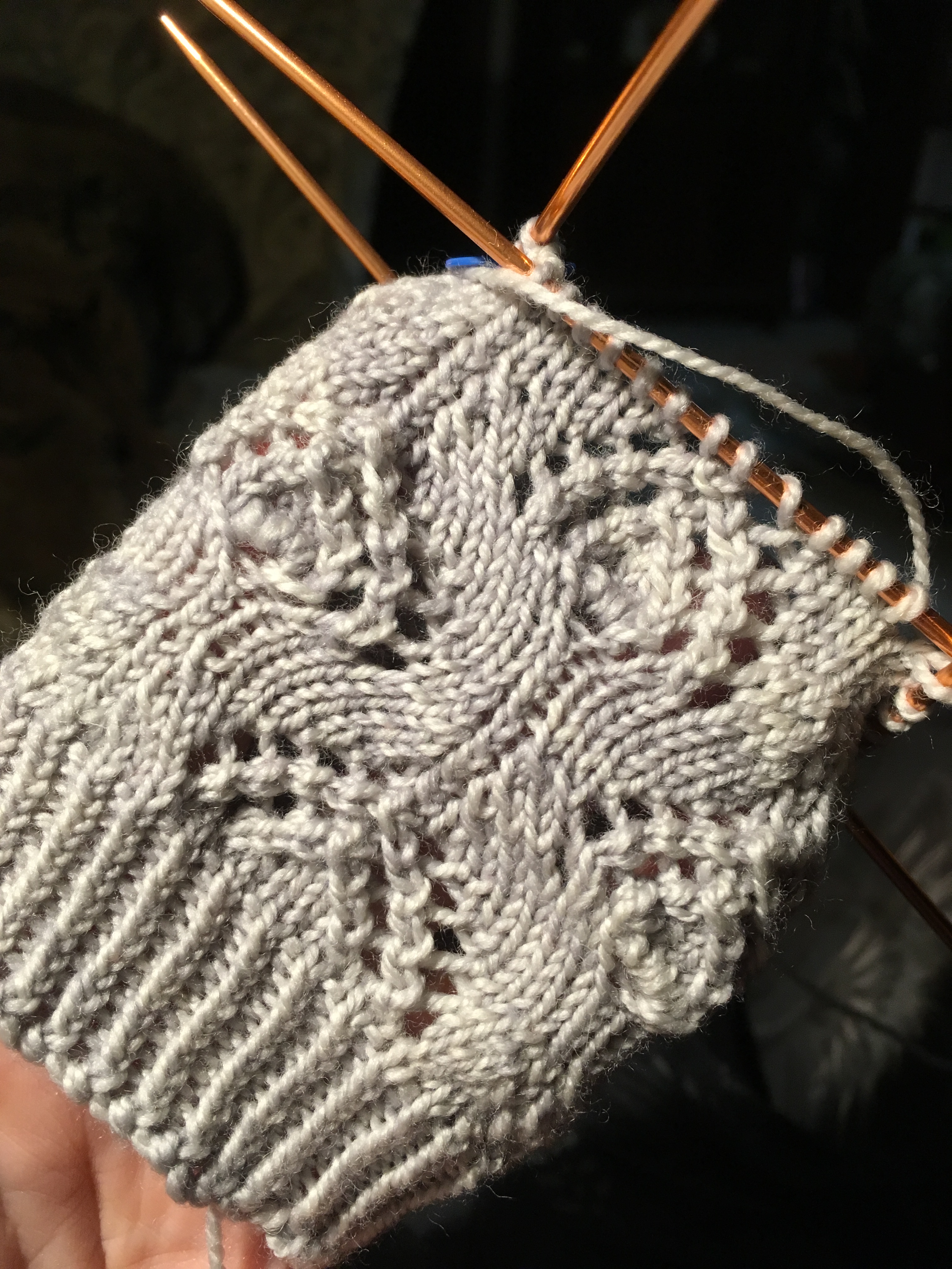 Recently, however, I my interest in this pattern was rekindled when I came across it in its charted form at the website KnittingFool.com. Well! Let me tell you, that made all the difference! Now I could see what was going on, knit up the sample as written and then actually start playing with pattern to make it do what I wanted. The first thing I did was convert it to a circular pattern and then I started shifting around the locations of the decreases. Such fun! Since the increases and decreases are NOT paired and don’t even occur on the same row, this is a pattern that is a bit more challenging to mess around with.